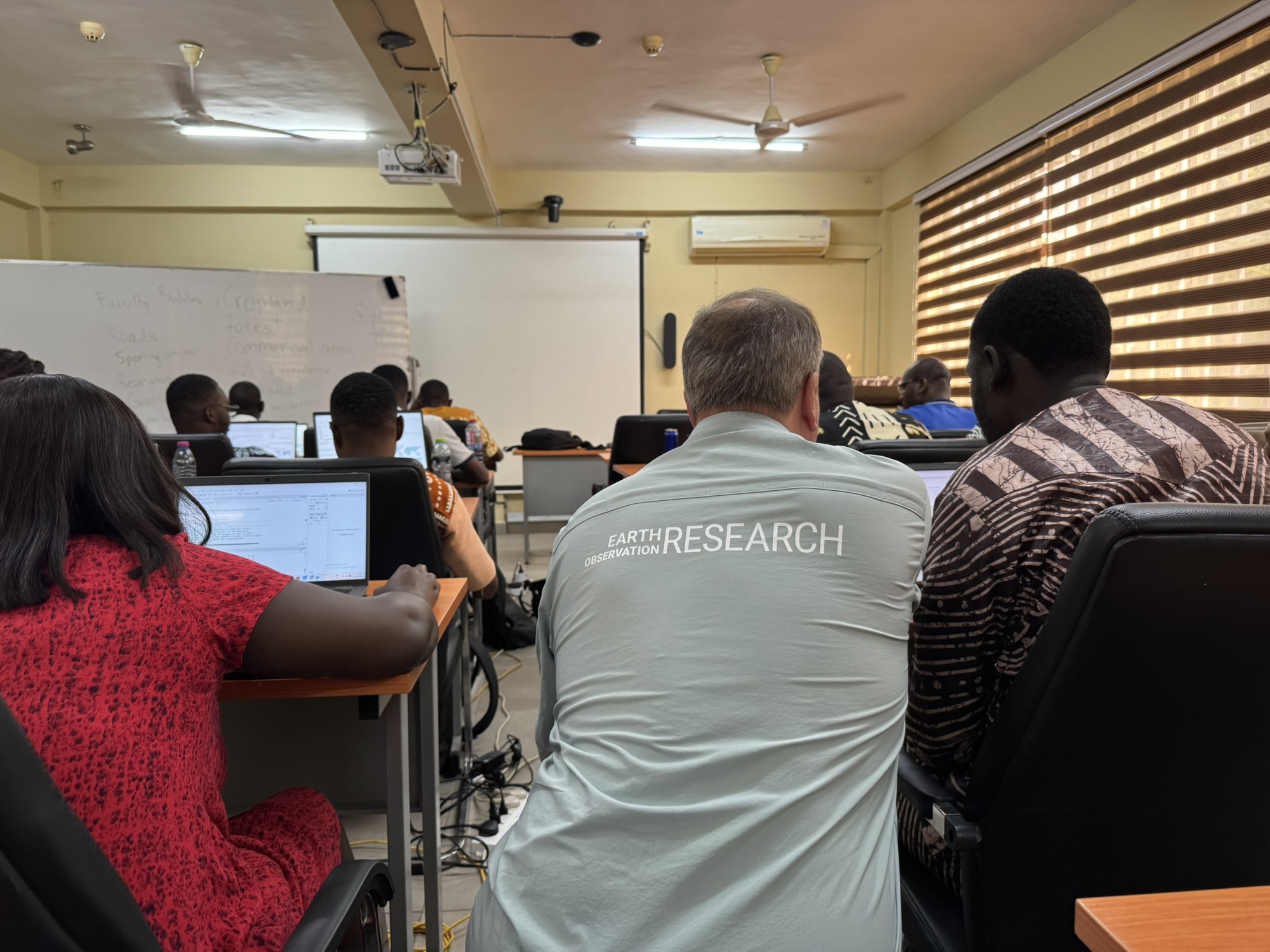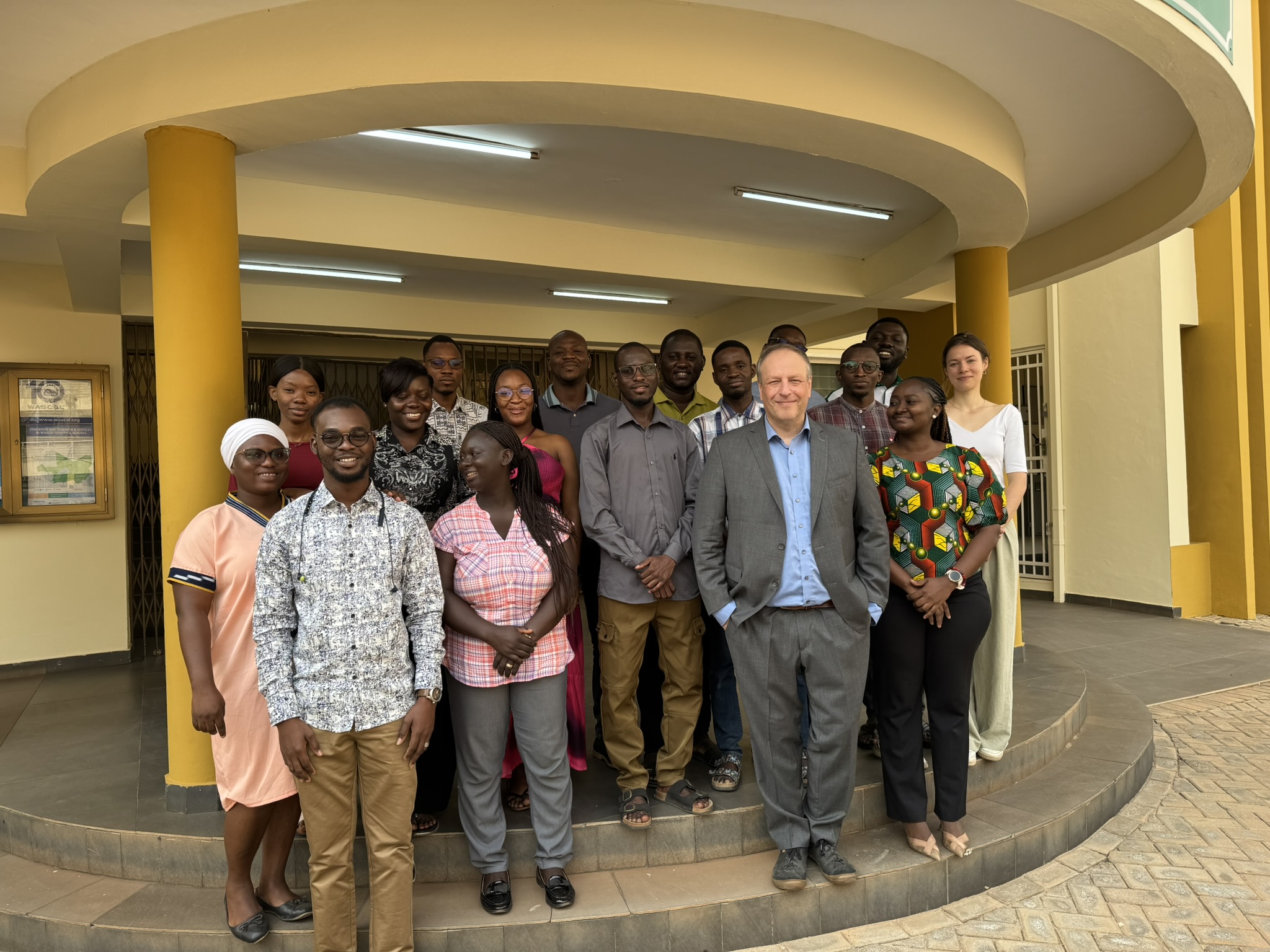 In the second week of our remote sensing training within the WASCAL Climate Change and Land Use program at KNUST in Kumasi (Ghana), our NetCDA team deepens the applied component of the course. The students learn how to use, adapt, and write their own code in R and Google Earth Engine (GEE) to analyze satellite data. We also explore how remote sensing can be applied to the students’ specific research questions. These activities were complemented by a field visit, during which we discussed and practiced various aspects of data collection across different land‑use categories.