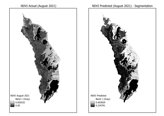 From the abstract: Normalized Difference Vegetation Index (NDVI) is widely used to monitor vegetation dynamics. However, the applicability of NDVI is limited widely in tropical areas due to the persistent cloud cover throughout the year. This project explores the use of Sentinel-1 SAR data derived indices to calculate NDVI. Sentinel-1 VV and VH backscatter imagery was used to calculate twelve indices. These indices, along with the Digital Elevation Model (DEM) of the study area were used to train a Random Forest regression model. Image segmentation was applied to aggregate SAR features prior to model training and prediction. The model was trained using cloud-free data from July 2021 and subsequently applied to July 2022 and August 2021 to assess its performance under unseen conditions. The prediction validation was done NDVI derived from Sentinel-2 imagery for the corresponding periods and a model accuracy of 60% was achieved. The segment based approach improved spatial smoothness in the predicted NDVI maps. However, fine scale details were lost. In addition, the model showed a tendency to underestimate NDVI extremes, particularly in areas of dense vegetation.