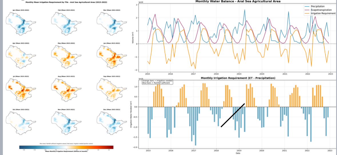 From the abstract: This presentation assesses streamflow dynamics and irrigation water demand in the Aral Sea basin, Central Asia, with a focus on understanding long-term changes in agricultural water use and their downstream impacts. The study examines how irrigation regimes have evolved over time, whether current downstream irrigation demand exceeds available river discharge, and if sufficient water reaches natural ecosystems. Using a spatio-temporal analysis framework, critical months of water stress are identified to evaluate mismatches between water availability and demand. The results contribute to understanding the role of upstream agricultural water diversion in the Aral Sea crisis and provide insights into sustainability challenges for river flow management and ecosystem preservation in the region.