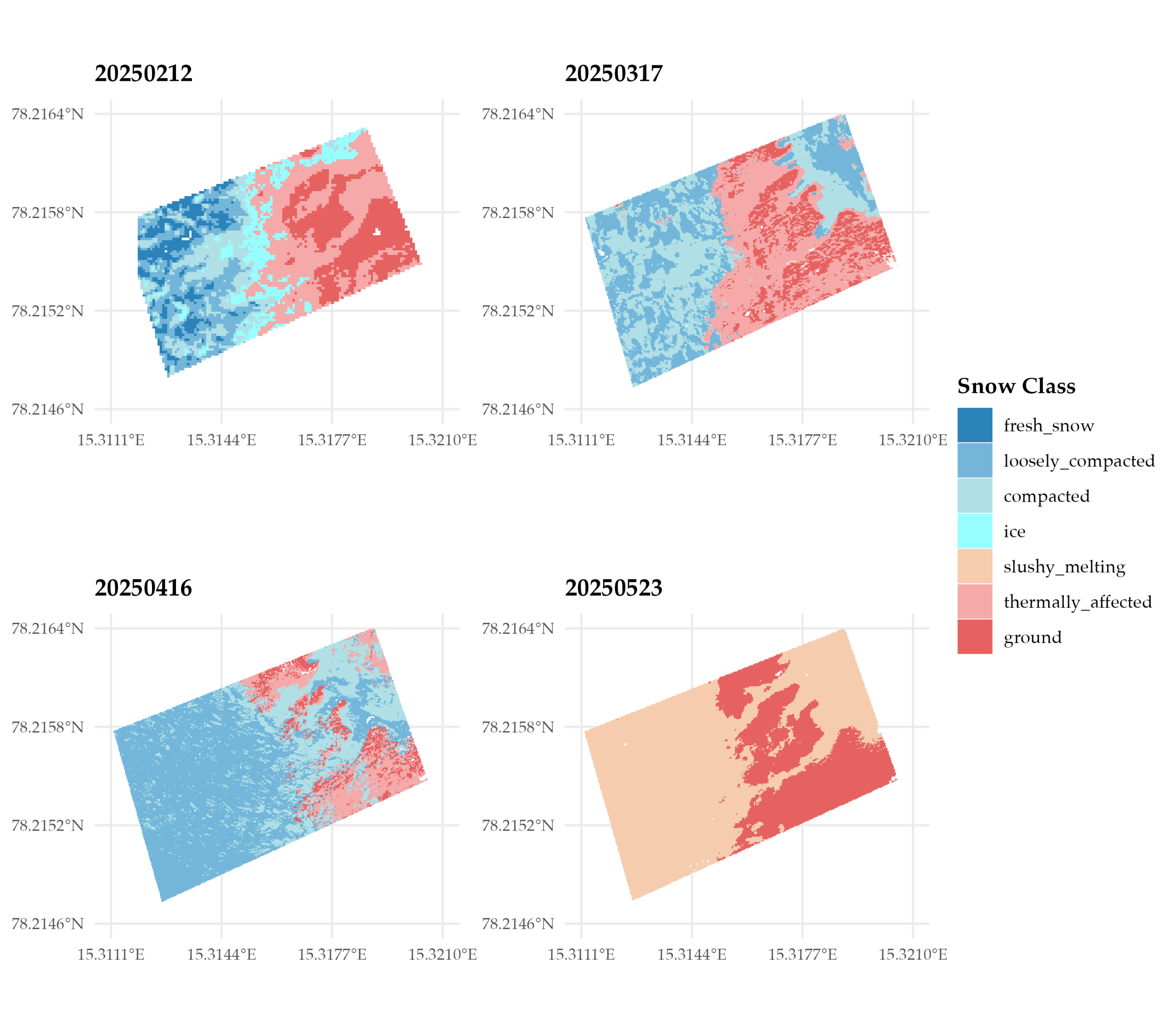 The Arctic is warming 2-4 times faster than the global average, with Svalbard among the fastest warming places on earth. Especially the winter months are affected by this warming with shorter snow-covered periods, increasing winter warm spells and rain. This in turn has far-reaching implications for Svalbard’s terrestrial environment. Despite the importance of snow however, critical knowledge gaps remain across disciplines – largely due to a lack of snow data on relevant spatial and temporal scales. This work addresses this lack of snow data by assessing the potential of thermal UAS for high-resolution spatio-temporal snow monitoring. Based on UAS and field data, collected during a field campaign in Bjørndalen, Svalbard from February to June 2025, the information content of thermal UAS and the relationship to in-situ measurements is analyzed. Correlation analysis and UAS-based snow products, including snow depth and local temperature variance (Delta T) maps, provided new insights into snowpack characteristics and their relationship to thermal drone imagery. A reproducible workflow for snow surface classification was developed and enabled spatio-temporal mapping of snow properties. The results show that thermal UAS reflect upper-layer snow characteristics without calibrating the thermal sensor beforehand. It is capable to produce ecologically relevant snow data on cm high spatial resolution. Limitations remain particularly regarding artifacts in the thermal imagery, difficulties of mapping old ice and snow processes happening within the snowpack. Overall, this study demonstrates the high potential of thermal UAS to complement snow research. While more research is needed to address remaining technical challenges, the possibility of high resolution mapping of drones provide novel insights in snow dynamics in Arctic ecosystem dynamics.