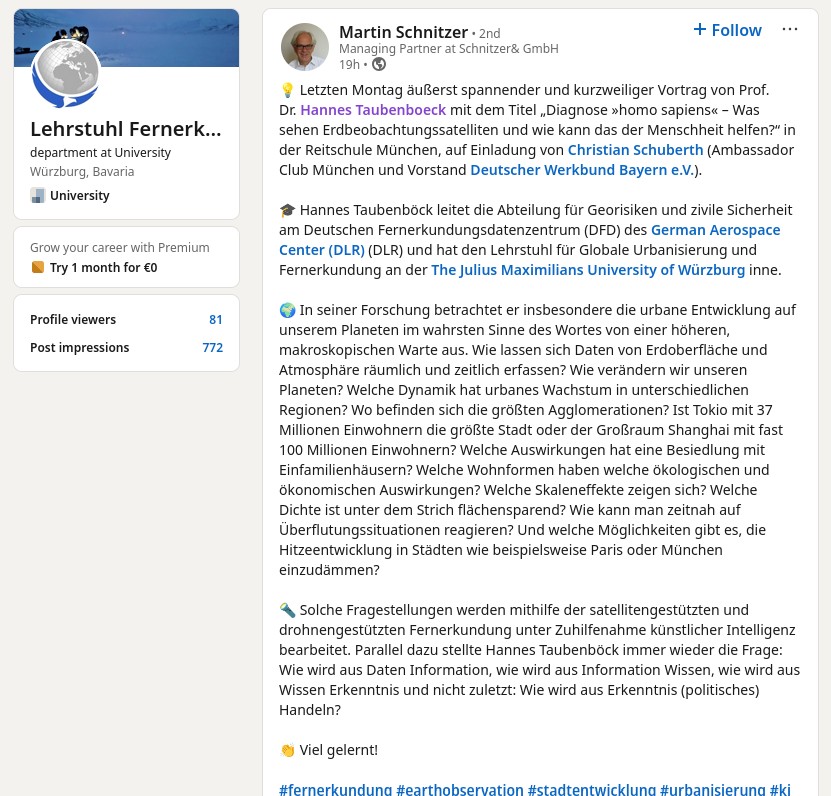 The Ambassadorclub Munich has invited Prof Dr Hannes Taubenböck to give an evening lecture in Munich on the 2nd of March 2025. The lecture was entitled „Diagnose »homo sapiens« – Was sehen Erdbeobachtungssatelliten und wie kann das der Menschheit helfen?” [engl.] Diagnosis “homo sapiens” – What do earth observation satellites see and how can this help humanity?”.