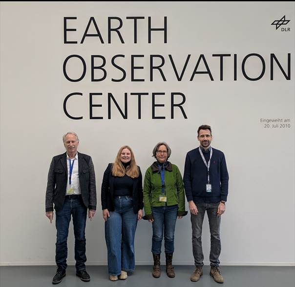 The image shows four of the participants of the hybrid kick-off meeting. From left to right: Dr. Klaus Martin (SLU), Marlene Kühnl (SLU), Dr. Petra Adler (Forstliche Versuchs- und Forschungsanstalt Baden-Württemberg), and Dr. Michael Wurm (DLR).