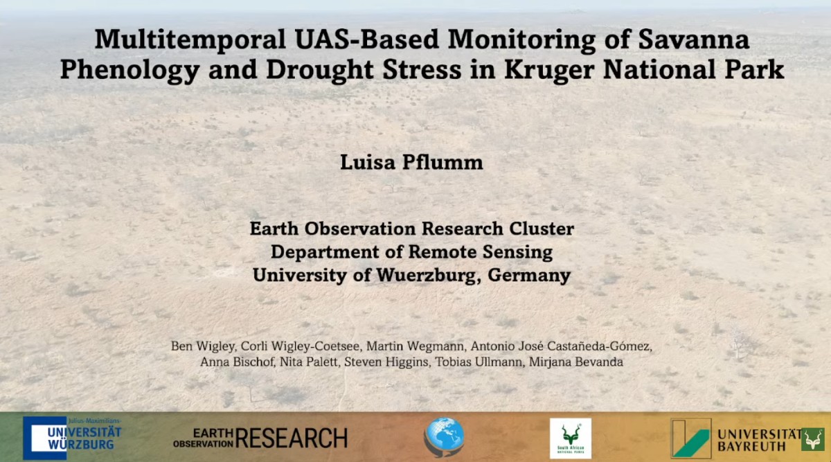 In her presentation titled “Multitemporal UAS-Based Monitoring of Savanna Phenology and Drought Stress in Kruger National Park,” Pflumm introduced results from an extensive two-year multispectral drone time series collected across study sites in the park. The dataset provides a detailed view of seasonal vegetation dynamics and early indicators of drought stress in savanna ecosystems, demonstrating the potential of high-resolution UAS observations for ecological monitoring.