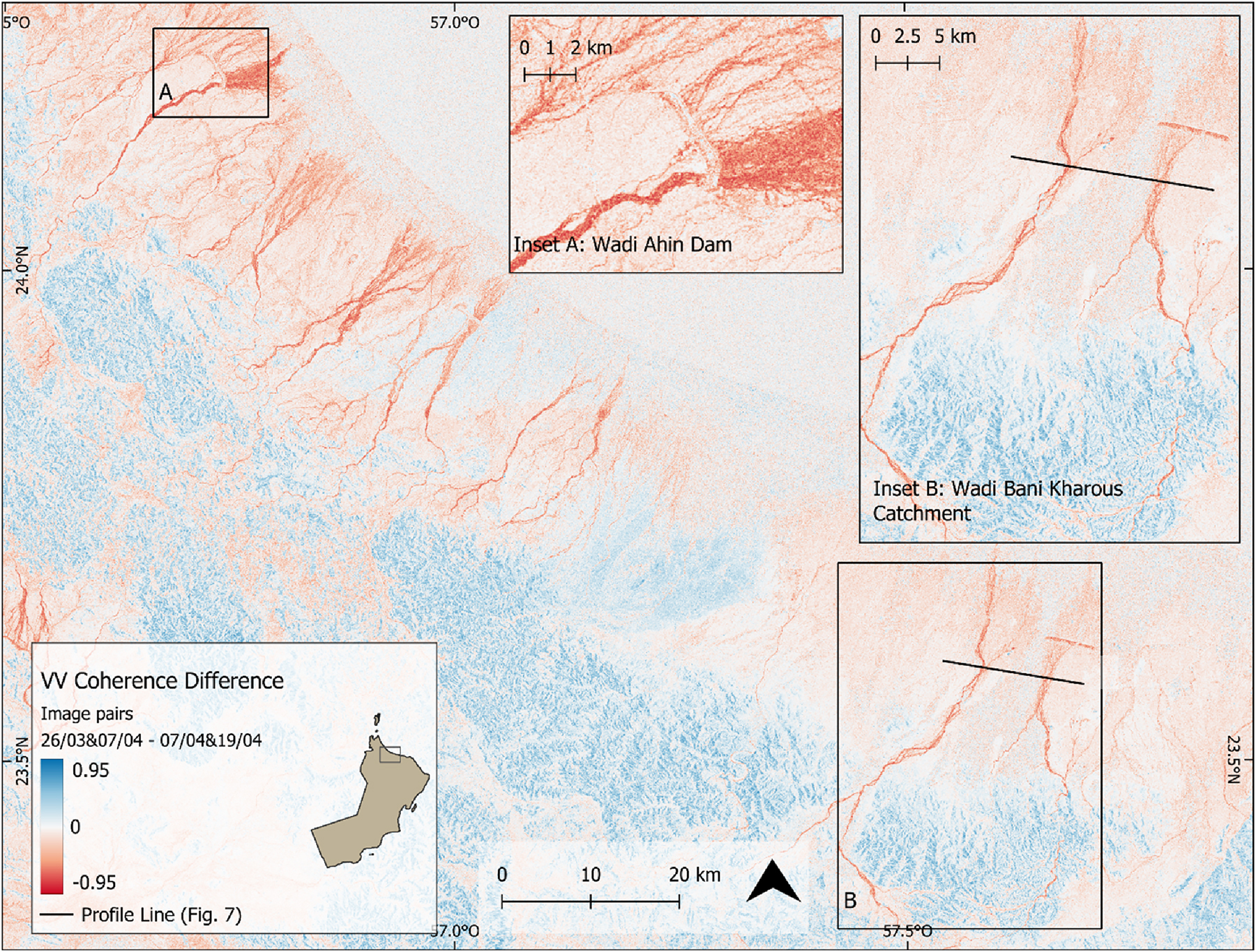 Abstract: In April 2024, northern Oman experienced an extreme flash flood triggered by rainfall totals exceeding one to two years of the regional average within 24 h. This study evaluates the performance of three remote sensing approaches for mapping flood-activated channels: Sentinel-2 Tasseled Cap Transformation (TCT) Brightness, Sentinel-1 Amplitude Change Detection (ACD), and Sentinel-1 InSAR Coherent Change Detection (CCD). Multi-temporal optical, SAR amplitude, and SAR coherence datasets were processed and compared with hydrological terrain indices derived from TanDEM-X elevation data. Results show that CCD provided the clearest and most spatially consistent delineation of flood channels, unaffected by cloud cover and less prone to noise than ACD, while integrating changes over time into a single product. Inside flow channels, coherence difference was shown to drop by up to 0.6 and being considerably lower than during stable conditions. TCT effectively highlighted bleaching of alluvial deposits under clear-sky conditions, and ACD proved most useful where flooding persisted at the time of acquisition. The combined analysis demonstrates that CCD, supported by optical and terrain data, offers a robust and transferable method for post-event flood mapping in arid regions. Its compatibility with Sentinel-1’s acquisition strategies makes it a practical tool for preliminary flood mapping and post-event assessment, especially in the context of increasingly frequent extreme rainfall events.
