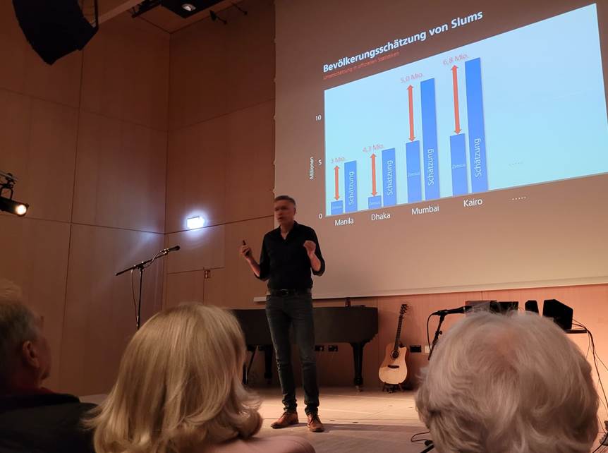 Hannes tackled a thought-provoking topic in his contribution entitled “Saßen Sie schon mal in einem Zug nach Mumbai? – Forschung im Grenzbereich zwischen Armut, Reichtum und Moral” [engl.: “Have you ever been on a train to Mumbai? – Research on the borderline between poverty, wealth and morality“]. In his presentation, the absurdities of extreme wealth in the reflection absolute poverty are something between dismaying, sad and unbelievable in their contrariness. He uses remote sensing research on slums to expose how official population statistics can undermine human dignity. With it, he demonstrates the balancing act between the demands of our own morals and the complex realities in a humorous way.