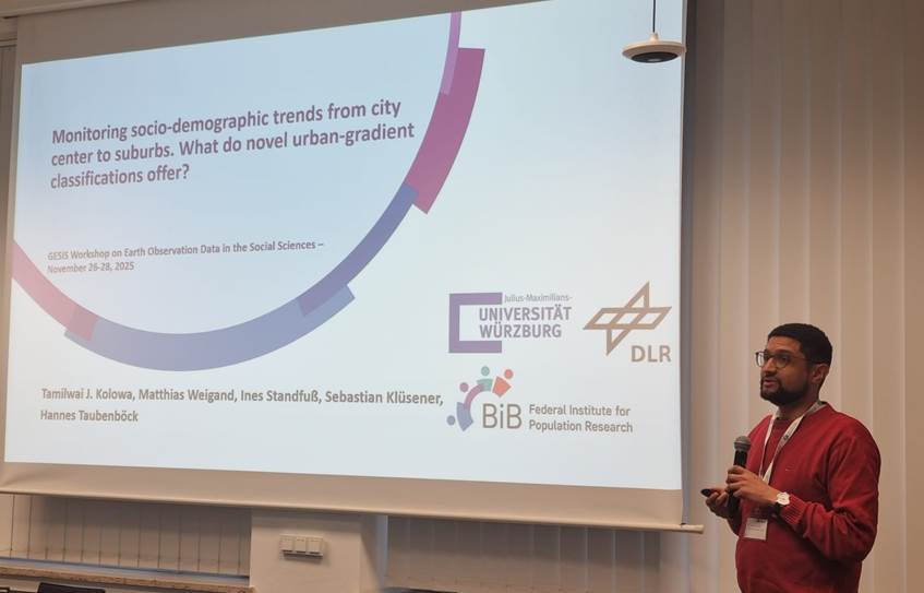 Our PhD student Tamilwai Kolowa (https://remote-sensing.org/new-phd-student-tamilwai-kolowa/) presented a research project that combines Earth observation and German census data at the GESIS Workshop on Earth Observation Data in the Social Sciences, held from November 26-28, 2025, in Cologne. Hi presentation was titled “Monitoring socio-demographic trends from city center to suburbs. What do novel urban-gradient classifications offer?“.